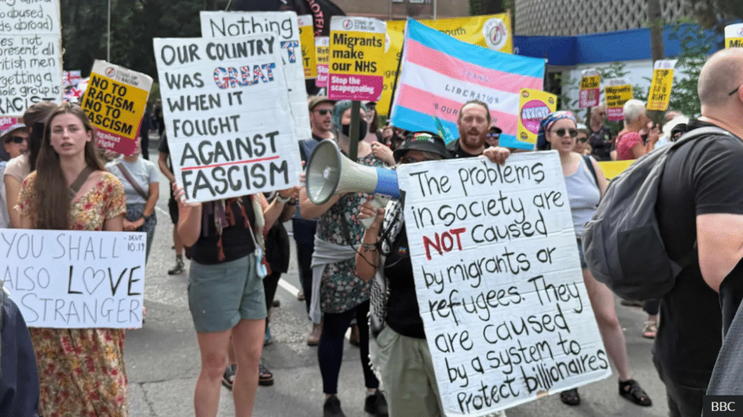 BBC reporter Sophie Cridland said there were about 200 anti-immigration protesters chanting “stop the boats and send them home” while waving Union Jack and England flags.